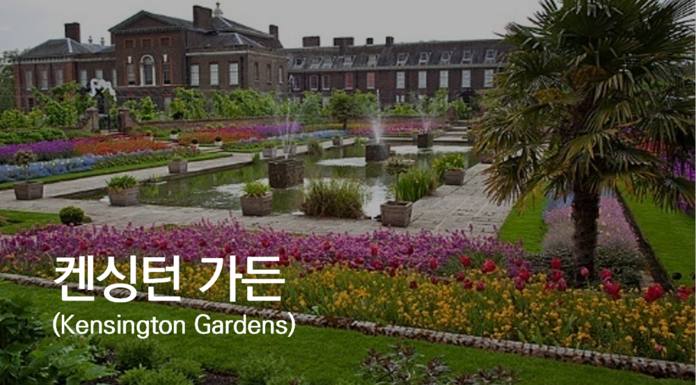하이드파크와 인접한 공원으로 원래는 영국 왕실의 정원이었다. 공원의 서쪽으로는 찰스 황태자와 고 다이애나 비가 생활하던 켄싱턴 궁전이 있다. 남쪽에는 빅토리아 여왕의 남편 앨버트 공의 기념비가 있는 등 영국 왕실과 깊은 관련을 가지고 있다. 랭커스터 게이트에서 남쪽으로 간 곳에는 2004년에 탄생 100주년을 맞이해 세워진 피터팬 동상이 서있다.