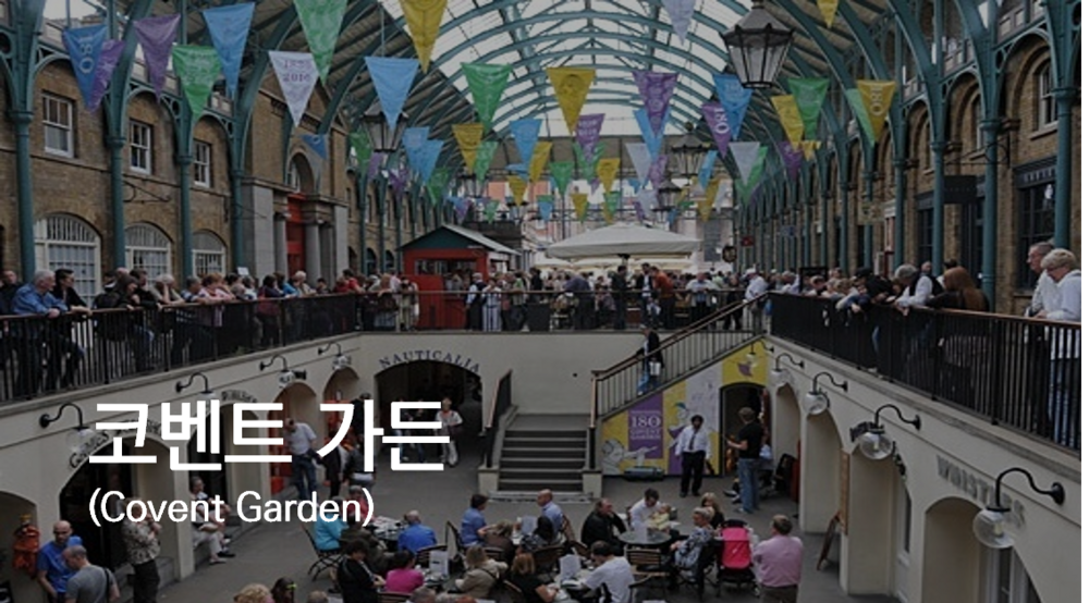 오드리 햅번이 꽃을 파는 아가씨로 나온 영화 ‘마이 페어 레이디’에 나온 시장이 바로 이곳이다. 광장 지붕을 유리로 만들어 비가 와도 편하게 돌아볼 수 있는 곳이다. 광장 주변 건물에는 상점과 음식점, 카페 등이 있고, 남쪽에는 작은 미술관과 박물관도 있다. 거리공연도 열리고 애플마켓, 주빌리 마켓 등 여러 마켓이 혼합되어 있다. 쉑쉑버거도 이곳에 입점 중이다.