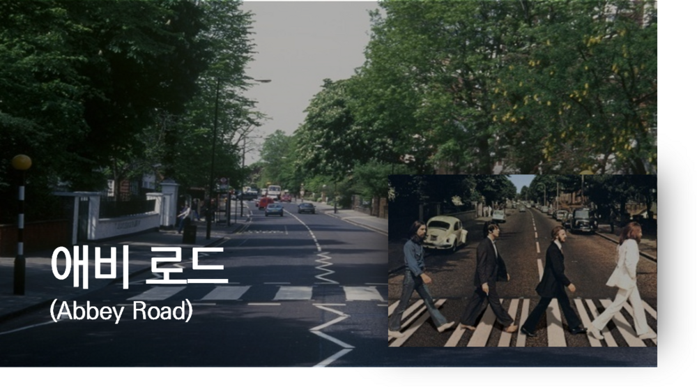 영국의 록 그룹 비틀즈가 1969년에 발표한 앨범의 표지 컷에 등장한 거리다. 비틀즈를 따라 하여 사진 찍는 관광객들로 항상 붐비는 곳이다. 실제 차가 운행 되는 거리이기 때문에 사진 촬영 시 주의해야 한다.